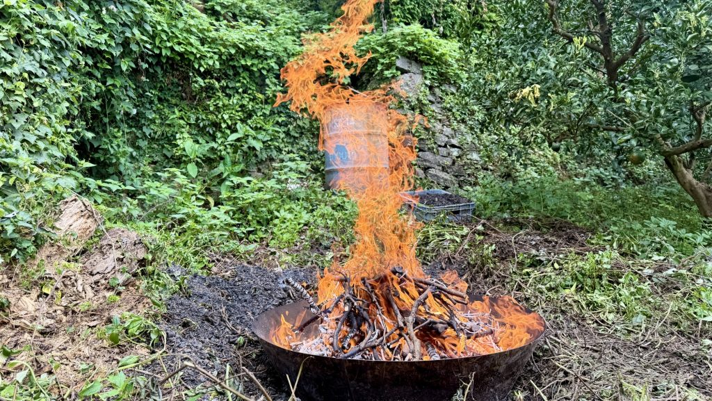 剪定枝の焼却処分を兼ねて、無煙炭火器を使用し炭化にチャレンジ。
